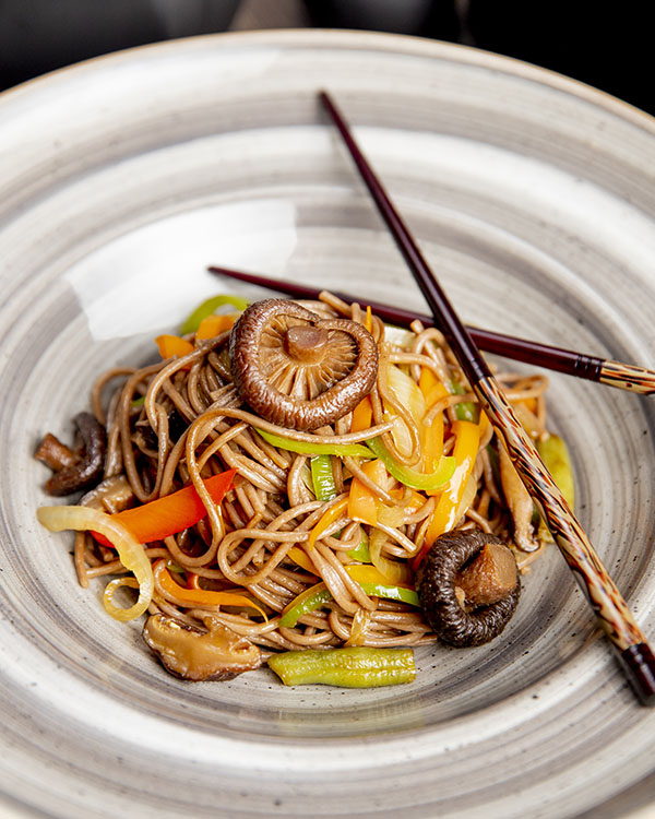 The main courses feature Cantonese-style lacquered Iberian pork, crispy duck with seafood sauce, or steamed sea bass with ginger and chives, served with fresh stir-fried noodles and pak choi with soy and ginger.